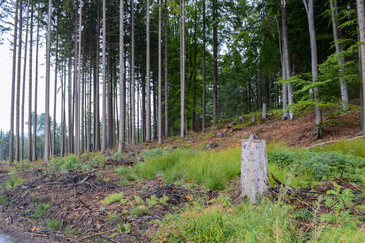 sukceskní mladý porost na ploše po větrné kalamitě na podmáčeném mírném svahu s prameništi